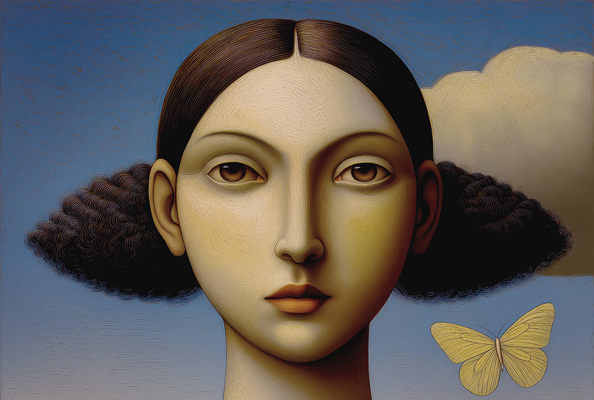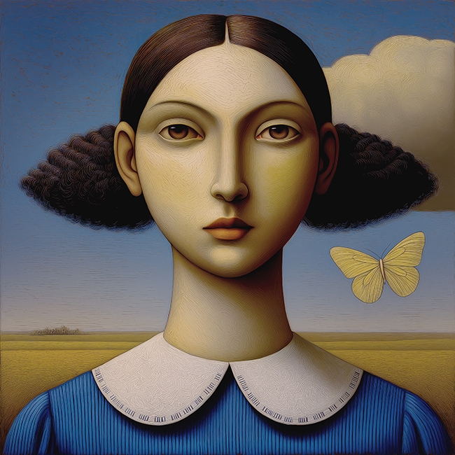 Such quiet is not empty. It is full of suggestion. The girl’s face, her balanced hair, the butterfly, the calm horizon—together they create a space where reflection takes root. The work does not hand out answers, nor does it insist on a single story. Instead, it lingers in ambiguity, that delicate space where beauty and meaning can breathe.
