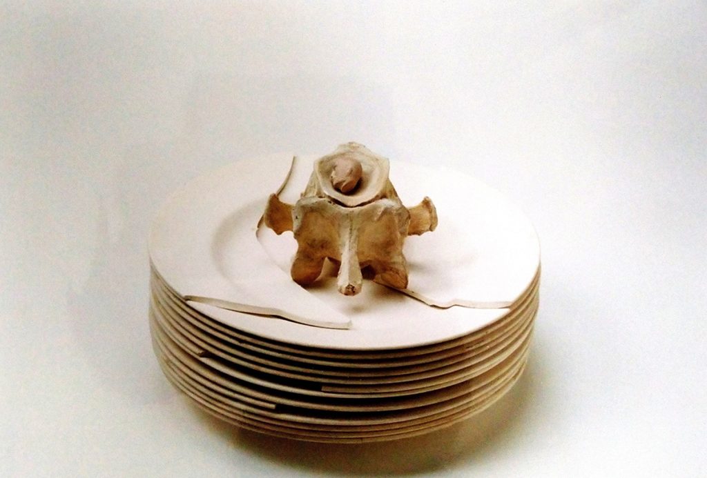 One of the most telling examples of her approach is her work Backbone. The piece is built from unglazed ceramic plates, deliberately left broken and imperfect. On top of this fragile surface rests the curved spine of an animal, its bone structure stark and unyielding. Within a cavity created by the plates, Kampfraath has placed a head, sculpted in repose, seemingly asleep. The work measures 35 by 25 by 25 centimeters, yet within its compact frame it opens an expansive conversation.