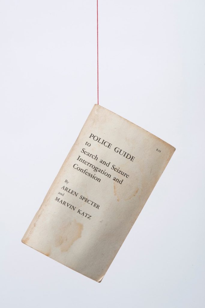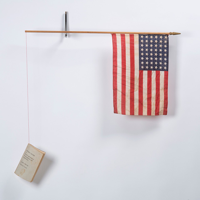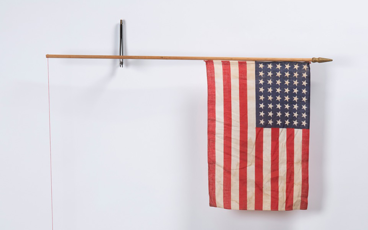One of Imboden’s most resonant works, Balance, speaks directly to the precariousness of democracy and the fine line that separates stability from collapse. The work is composed of vintage straight razors, each mounted perpendicularly to the wall. From these blades hang American flags, held in place not by the firmness of the razors but by counterweights that extend the composition outward.