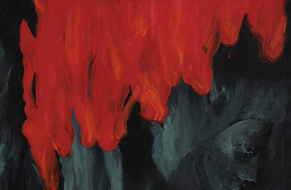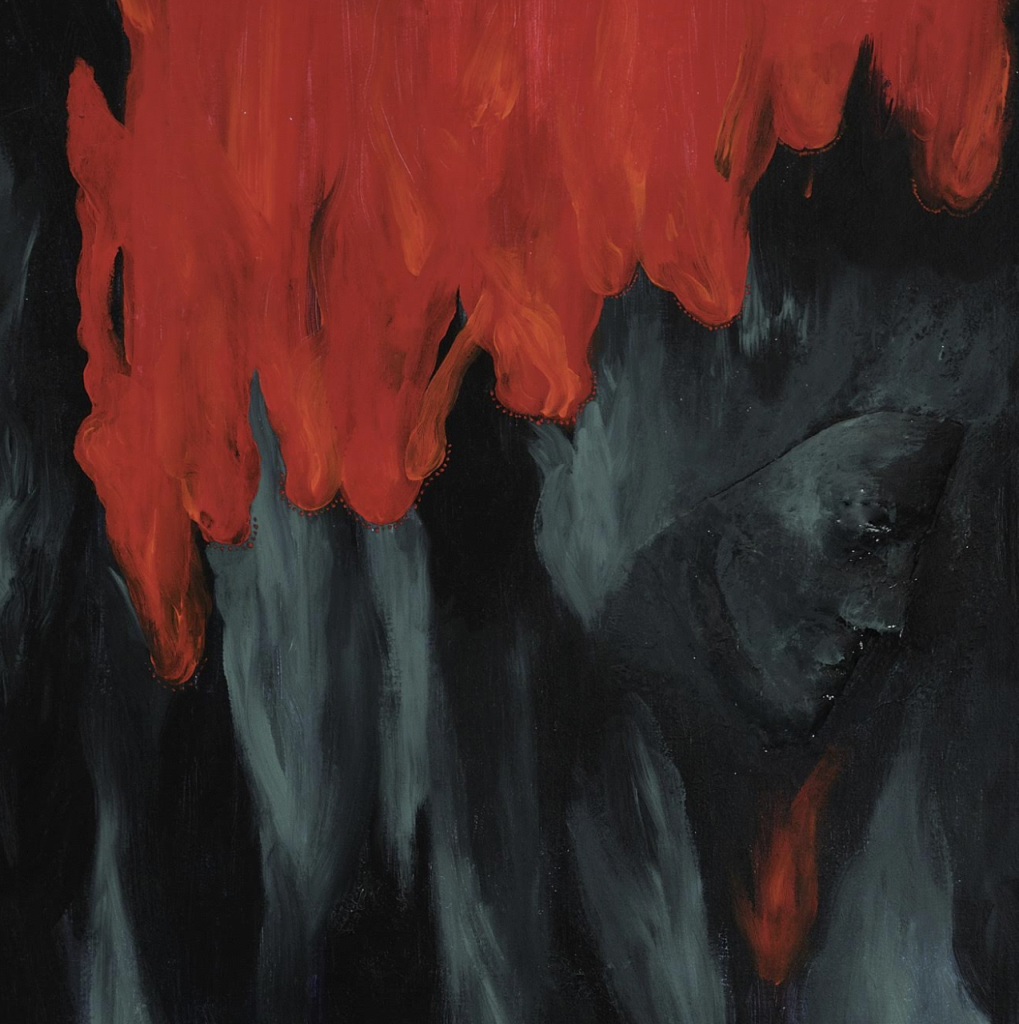 The flames that move across the background don’t roar or explode. They rise in slow vertical lines, more like breath than fire. Yet the colors—black, green, and red—carry the heaviness of mourning. Black is the color of void. Green, often linked with nature or renewal, here turns dark, almost toxic. Red, the faintest but most piercing, signals both pain and life force. Together, the palette becomes a field of contradictions: death and vitality, silence and burning, permanence and collapse.