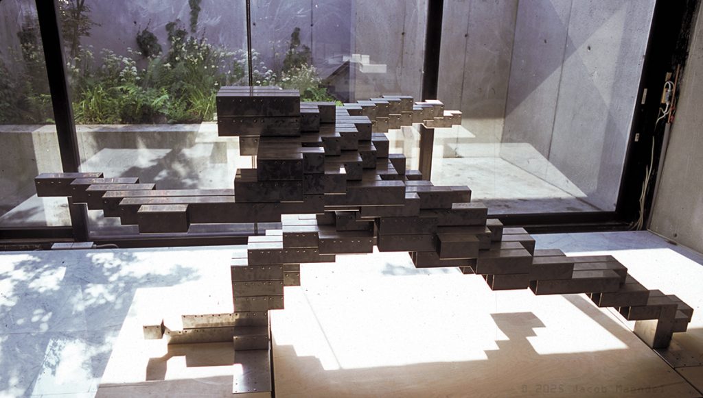 Jacob Maendel’s art is not about fitting into movements or following trends. It is about creating a language that reveals the underlying structures of existence. In 37 22 15, he transforms stainless steel into an exploration of balance, opposition, and the act of moving through space. The work stands as both object and event, presence and absence, body and void.