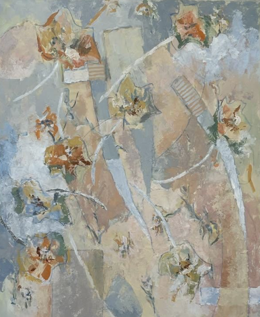 Her paintings offer a kind of aerial or suspended perspective. In the artwork shown above, loose plantlike forms stretch across a field of broken shapes. Pale peach and cool grey planes shift beneath clusters of ochre and rust flowers. Lines sweep diagonally, recalling stems or paths or internal maps. There is both movement and stillness: a drifting softness contrasted with structural edges.