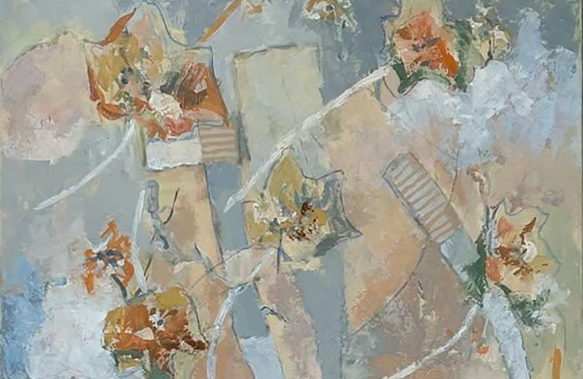 Her paintings offer a kind of aerial or suspended perspective. In the artwork shown above, loose plantlike forms stretch across a field of broken shapes. Pale peach and cool grey planes shift beneath clusters of ochre and rust flowers. Lines sweep diagonally, recalling stems or paths or internal maps. There is both movement and stillness: a drifting softness contrasted with structural edges.