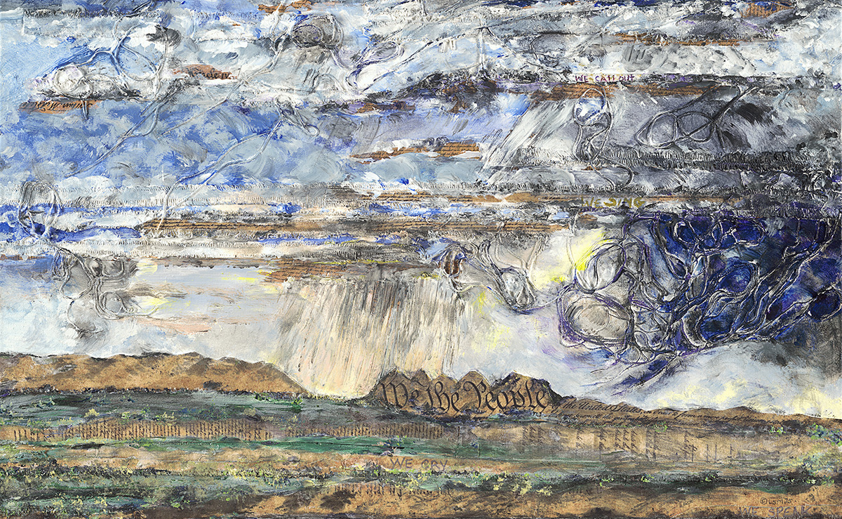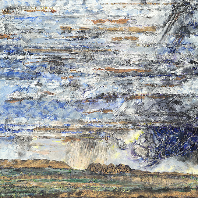 The title is a declaration. The People Speak suggests democracy, the assertion of voice, the insistence that no single authority can silence the chorus of a nation. This is made more poignant by Morris’s decision to weave into the work the founding documents of the United States. By embedding these texts directly into the painting, she forces us to look again at words that are often repeated yet rarely examined. Their placement on canvas implies that they are not static, that they must live, shift, and even fracture if they are to remain relevant.