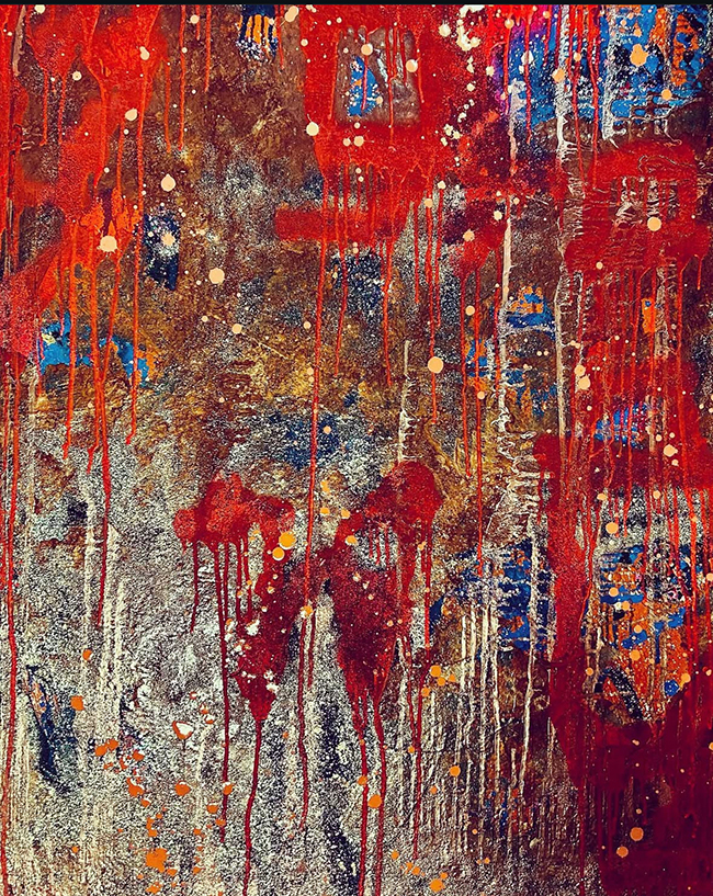 “Chasing Ghosts” (40” x 31”, mixed media on canvas) is one of those works where Lola Szent-Gyorgyi allows her broad vocabulary of visual references to converge. The piece is raw, nocturnal, and restless, pulling from street walls, gang markings, the red flare of danger, and the older language of cave painting.