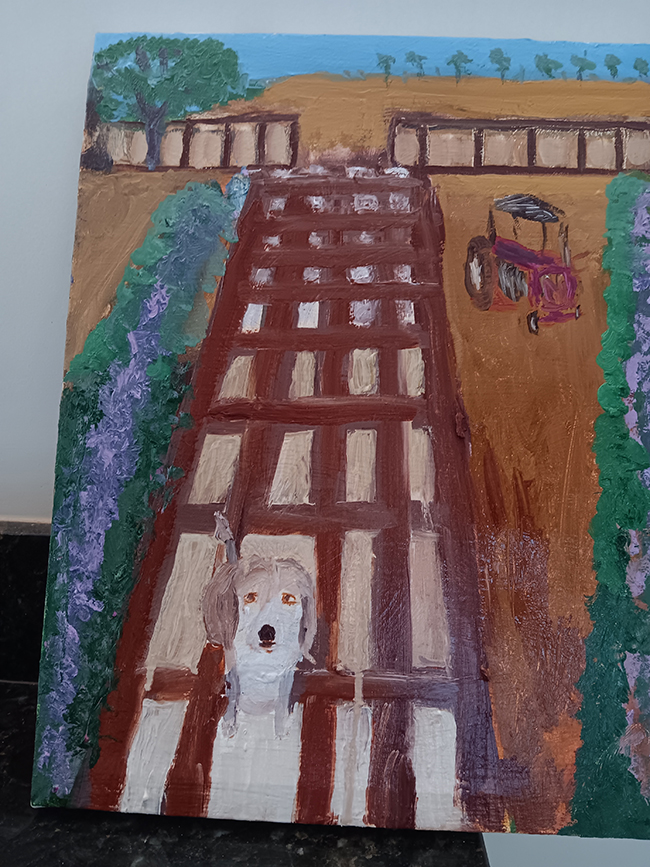 The work ties together multiple strands of Collier’s life. The driveway and the beagle belong to family. The tractor placed in the background is a tool from the farm in Capapolis, Brazil—a place Collier knows well, both for its agricultural rhythm and for the personal reality of visiting there during his ongoing dental treatments. The painting is also tied to his mother’s house in the same Brazilian town. Together, these details root the work not only in visual reality but in a patchwork of personal spaces, routines, and connections.