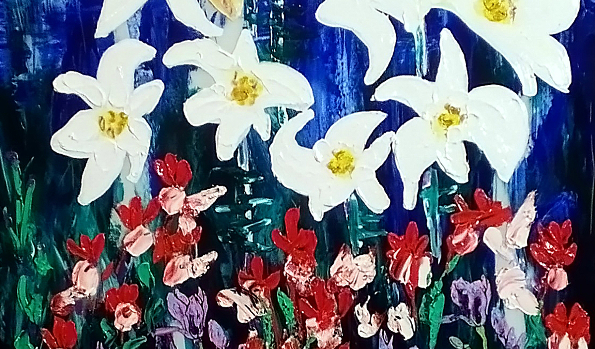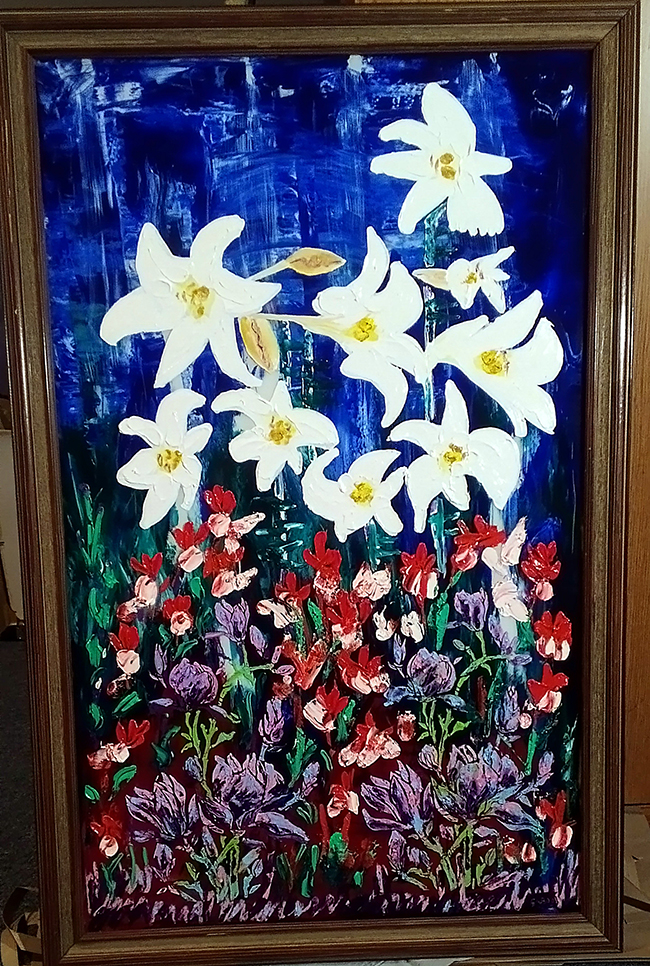 “Secret Garden” is an oil on glass painting, measuring 24 by 39 ½ inches. At first glance, it draws the eye upward toward the lilies of white rising into a sky that feels timeless. They reach like living flames, tall and tender, the petals catching light in a way that almost vibrates against the glass. Around them blooms a multitude of floral patterns and colors. The scene is less about reproducing nature faithfully than it is about translating its rhythm into something intimate, something that feels carried inside the artist’s memory.