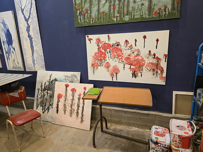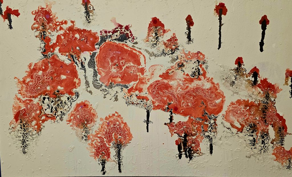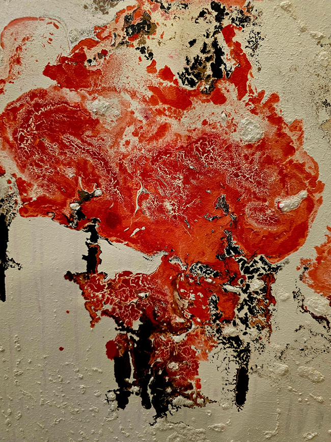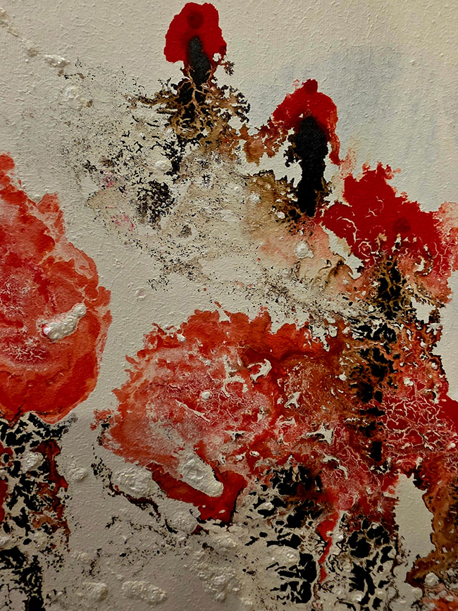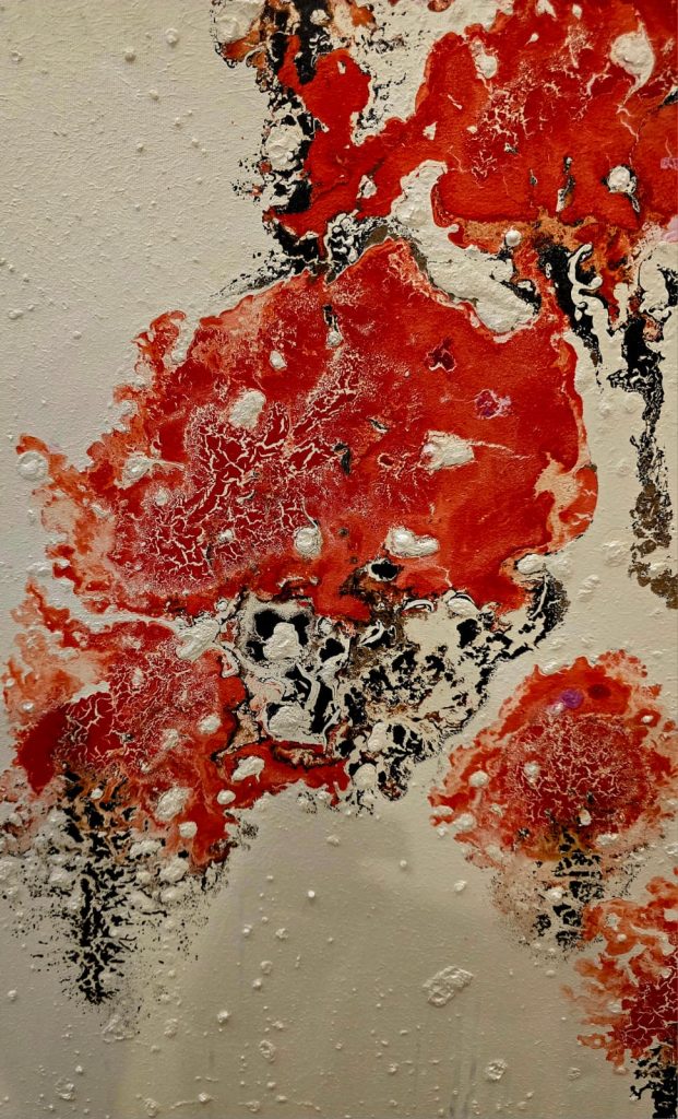 The SuperNova series is Barr’s way of exploring what it means to live within fragility. These paintings carry the language of cosmic explosions and natural metaphors, binding the distant with the immediate. In the piece SuperNova – Anemone, Barr narrows this exploration into a single flower, creating an image that vibrates with both vitality and loss.